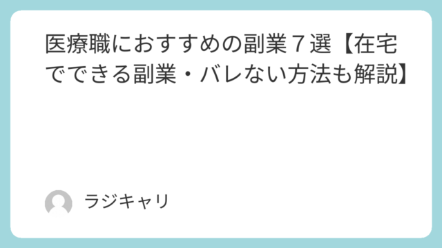 副業 医療職におすすめの副業7選【在宅でできる副業・バレない方法も解説】 医療職は専門性が高く、安定した職業と言われています。実際私もそんな安定性を求めて診療放射線技師の資格を取りました。しかし、実際に働いてみると、・給料がなかなか上がらない(評価制度がいまいちで年功序列)・夜勤は稼げるけど、健康をお金にしてる感... 2026.03.09 副業医療職キャリア